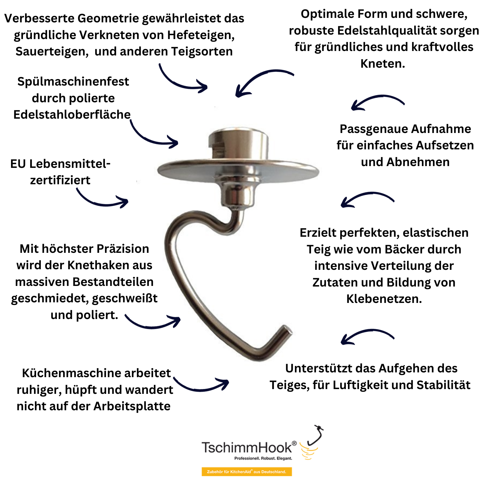 Der verwendete Edelstahl ist pflegeleicht, langlebig und hygienisch. Sachgemässe Pflege und Reinigung gewährleisten den Bestand der polierten Oberfläche. Der Edelstahl Knethaken kann problemlos in der Spülmaschine gereinigt werden.